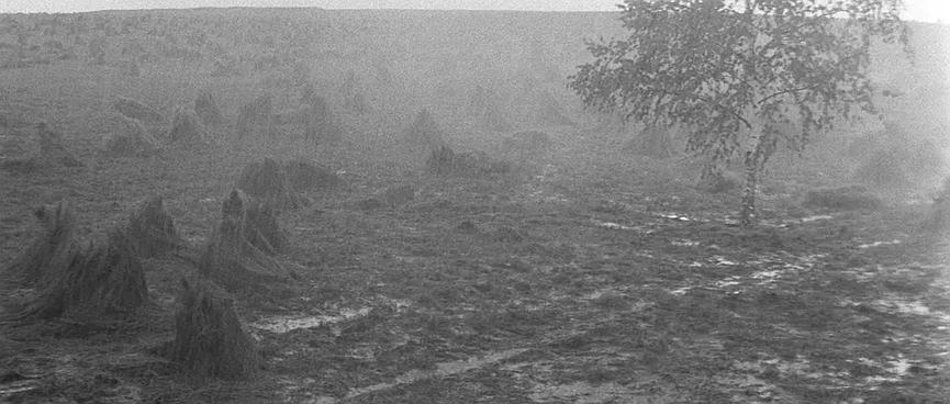 卢布廖夫一行人走在草垛间,正当几人赞叹着白桦树的生命力时,突然天降大雨,他们不得不躲到农民的屋舍中。随即,他们见识到因为连绵的大雨,农民无法投入种植,生产活动被迫停止,此为“天灾”。在屋舍中,流浪艺人尽情表演着他的才艺,以哗众取宠的方式来博取生计,男人们占据着生产权,妇女与孩子们被排斥在屋舍外,只能遭受天灾的突袭。卢布廖夫一行人进屋后,场面恢复了平静,不久过后,流浪艺人被军人们发现,随即惨遭暴力的折磨。这一切的背后,都是因为当时社会频繁爆发的战争,此为“人祸”。对于普通人民来讲,无论是“天灾”,还是“人祸”,都不是他们能决定的,灾难的来源是命运,影片在这种基调下展开了一系列故事。