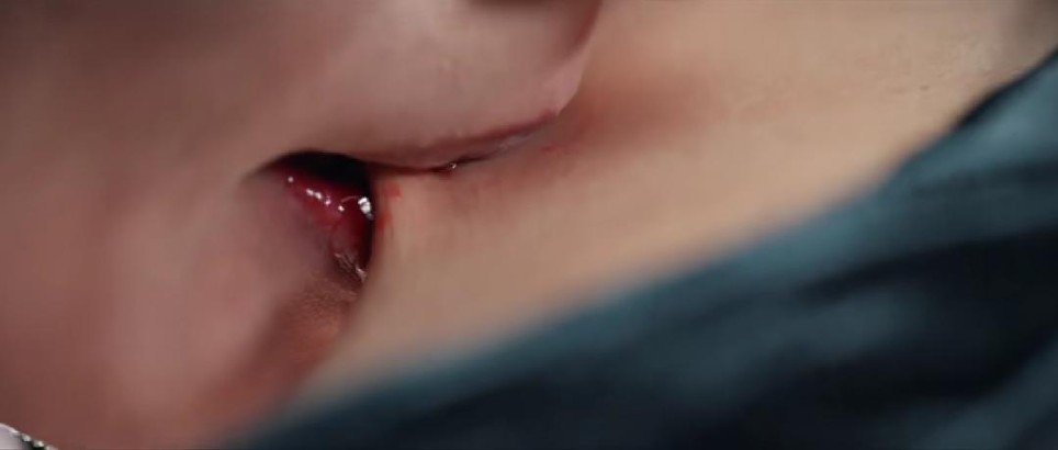 然后,女主一口咬在男主脖子上,虽然看起来只是咬起了一层皮,但我们知道她实际上恨不得咬下他一块肉。其实脖子上血管多,女主这个咬法不对,也不像是被逼到激发出兽性的咬法。野兽的咬法应该是凶狠的,张大嘴狠咬血管或气管。当然,这样咬不好看。
