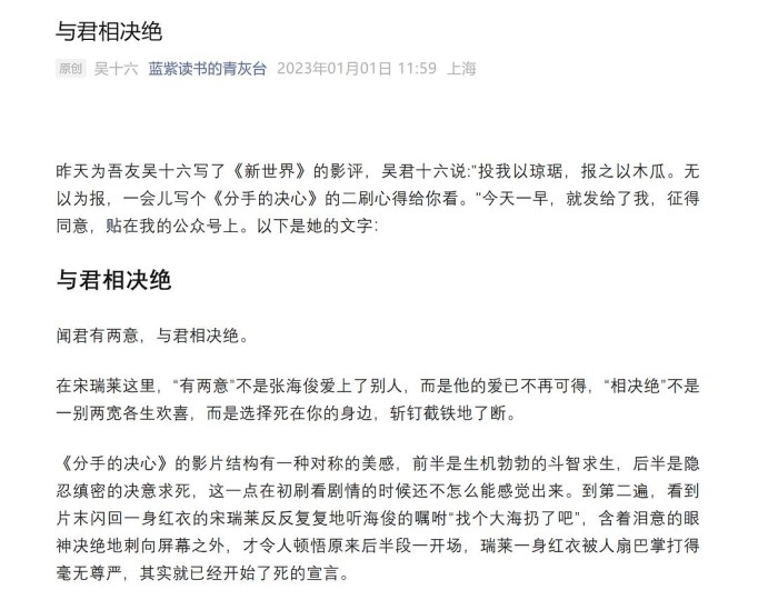 在宋瑞莱这里,“有两意”不是张海俊爱上了别人,而是他的爱已不再可得,“相决绝”不是一别两宽各生欢喜,而是选择死在你的身边,斩钉截铁地了断。