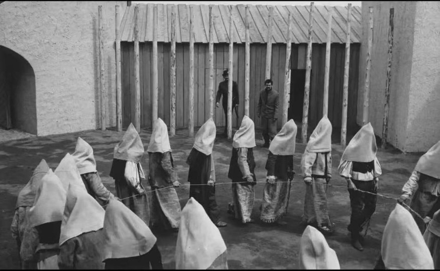 导演对叙事弱化的独特处理方式,以及对人物与心理的极致淡化,也在此处得以切实确立。影片前期场景中,曾有一位农民看似有望成为主角:他试图通过向军官告密、揭发其他囚犯来换取自身惩罚的减轻,这番交涉却以徒劳告终。但个体能动性与叙事推进这两大核心驱动力,很快便归于无效。此外,《静默与呼喊》与《红色赞美诗》中所呈现的 “群体主角” 意识 —— 这种设定隐约契合共产主义理念,也借‘群体主角’承载着 “真实” 的革命行动 —— 在本片中似乎从无成立的可能。无论是个体还是群体,都远未拥有足够的自由去推动任何有意义的改变。唯有遥远的帝国政权,才具备这样的能力。