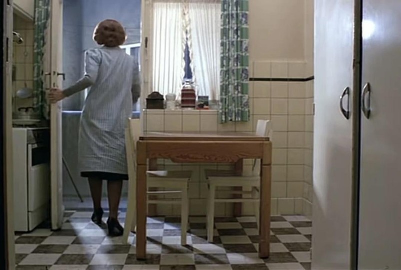 个体有意识的行动能返回自身的欲求,是个体能成为一个自由生命的前提,但与自由生命相对的是苦恼生命,他们的行动无意识、无法返回自身的欲求,相反,他们的行动受外在的精神驱动,最终仅惠及除自身外的周遭世界。所谓苦恼生命,是仅为共体而存在的他物,他们作为个体,与共体是对立的,且永远无法找到同类并形成共体;作为有自我意识的生命,他们与自我也是对立的,因为他们受外在精神影响把自我外在化成了客观事物,这个过程犹如植物纤维被做成布料,并进一步加工成惠及他人的衣服、桌布、窗帘,并且在一次次使用过程中被折叠、起皱、划平。 让娜重新穿好衣服,她脚底的橡胶高跟鞋和木制地板、木门、木桌子、木椅子,伴随着她的走动形成了静态的“场面调度”,它并非由摄影机的运动完成,而是由他物意识的确定性完成,通过这种确定性这些木制的家具、布料做的衣服转化成了让娜的自身,并从儿子出生时就伴随她但还只是抽象范畴的家庭主妇的命运中预感到一种家庭伦理共体的实在性,正是这种实在性,家庭伦理能作为一种精神影响她的判断从而影响她的情绪,因此在儿子回来之前她会紧促地清洗打理自己、准备好晚餐,三十年的坚持让这一系列行动有条不紊,但因为家庭伦理精神的影响,儿子的回来还是让她有点慌乱,尽管儿子对她没有任何威胁。 被解开的围巾、铺平的桌布、书本、信件展开了母子关系。“吃饭时不要看书”,让娜这句展露着关心和母亲的威严,同时暗示儿子把注意力放在和自己的交流上,但儿子瞥向了桌布,即使母亲拿出亲戚的信来念,他也一直盯着桌布,没有看母亲一眼,让娜其实也没有看自己儿子的脸,她的目光一直放在围巾、衣架、盘子、锅炉上,母子俩的目光投射到的物品,反过来引导他们行动的方向和距离,这些方向和距离在搬家之初是让娜设计和测量的,那时她的意识还是自我的、她意识的行动是利我的,而如今,即使她在楼道、电梯、街道、商店里,她的行动方式还是遵循着家庭伦理的精神:由物品(口子货架)引导目光、低头等待排队(正如等待土豆煮熟)、高跟鞋在街道的砖瓦上的节奏与在木制地板上的节奏一样有条不紊却略带一点慌张,而她要做的不过是修鞋和补衣。 鞋和衣,不论是放在商品货架上、穿在人身上,还是放在地上任人拾取,都只是鞋和衣而已,不过有一种特殊条件它们不再是自己本身,即:鞋要放在鞋柜里,衣服要放在衣柜里。鞋柜挨着大门,打开门就能看到鞋柜;衣柜在床的侧边,睡觉前和起床后都要打开衣柜。在这些布料被折叠前、在这些被做成家具的木头发出响声之前,可以看到它们似乎通过家庭伦理精神返回到了自身简单性中,重新成为了有机自然的生命,只是这个自然不是一种理性的、创造性的,而是单纯的无意识的习惯,没有任何精神活动和感性存在,只有几十年家庭主妇生活对自身外在化的客体事物之存在的确定性,因此,这些鞋和衣,就跟让她惊慌的儿子一样,是她的血和肉。 二、瓷器与镜面:对自我欲求的欺骗 当自我在欲求时,它就会随着它的判断运动,从而面对由判断引导的现实以及现实里的实物,对实物性质的认知和对实物的获得(对象化)会让欲求得到满足,但是也存在一种情况,就是做出判断的不是自我,而是他者,在由他者引导的判断里意识到对实物性质的认知不符合自己的欲求,却最终还是选择获得,并从他者的精神那里寻找借口说服自我去接受这个获得,这样的过程就是对自我欲求的欺骗。