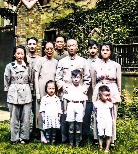 1945年12月12日,何遂家的全家福。何遂在照片後題字:“民國三十四年九月二日,日寇簽降。雙十二全家聚於渝,攝影留念。抗戰八年,家人無恙,長次三男均成家, 長孫申佳已三歲,殊可喜也。”照片前排左起:女兒何嘉,妻子陳坤立,二子的大兒子何孟嘉,何遂,四子何達;後排左起:二子何世平,二兒媳韓蘊,長子何世庸(11歲起在加拿大讀中學,後來歸國讀大學,在沈陽學醫,他是何遂四個中共地下黨員子女裏第一個入黨的),長兒媳李智勤,三子何康,三兒媳繆希霞(繆希霞是廣西大學校花,比何康年長三歲半,本來何遂夫婦想禮聘為長媳,沒想到大小姐愛情至上,與同在廣西大學讀書,近水樓台的“三弟”何康相愛了)